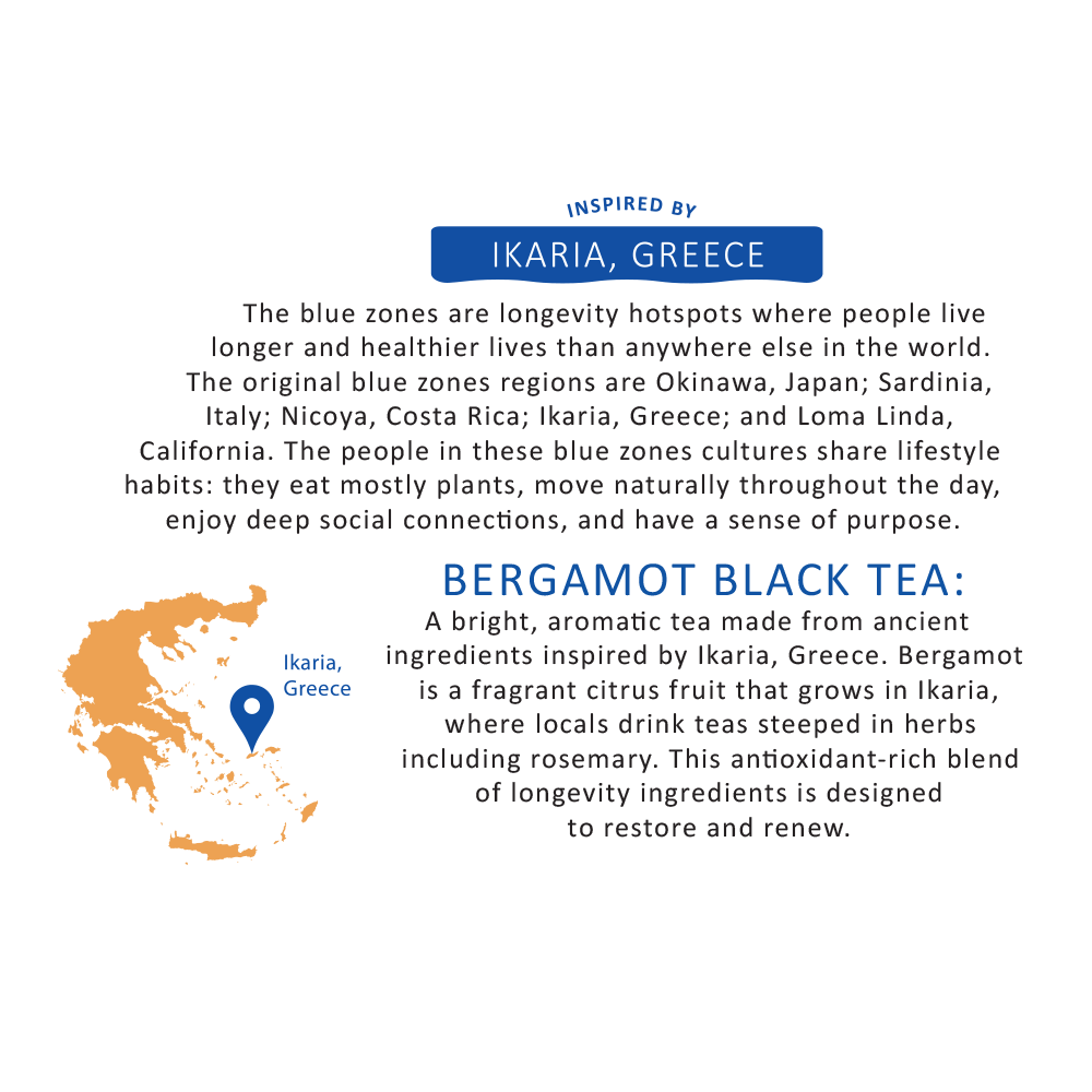 Bergamot Black Tea inspired by Ikaria, Greece: Bergamot is a fragrant citrus fruit that grows in Ikaria, where locals drink teas steeped in herbs. This antioxidant-rich blend is combined with the juices of stone fruits, watermelon, and strawberry, designed to restore and renew.